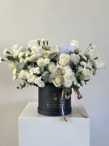 Arreglos con variedad de flores en tonalidades blancas.