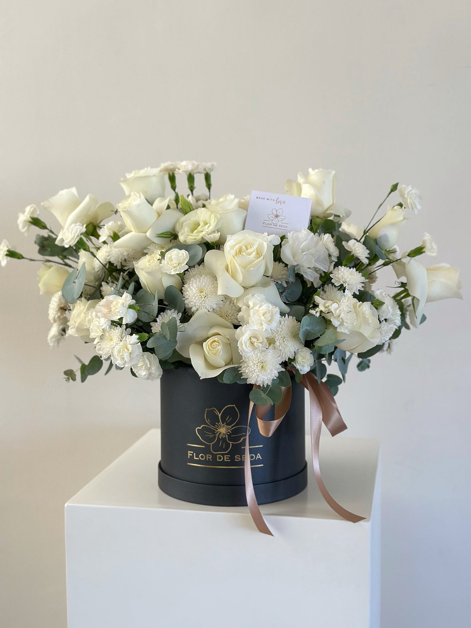 Caja con rosas, crisantemo, clavellina, clavel y variedad de follajes.