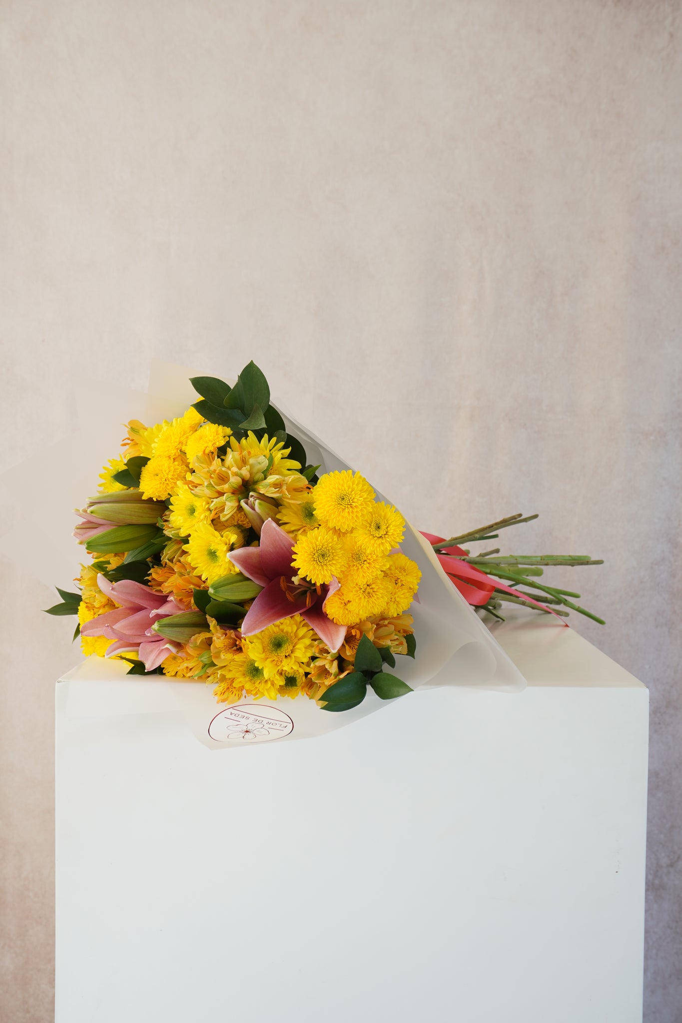 Bouquet de margarita, alstromelias, lilis y follajes.