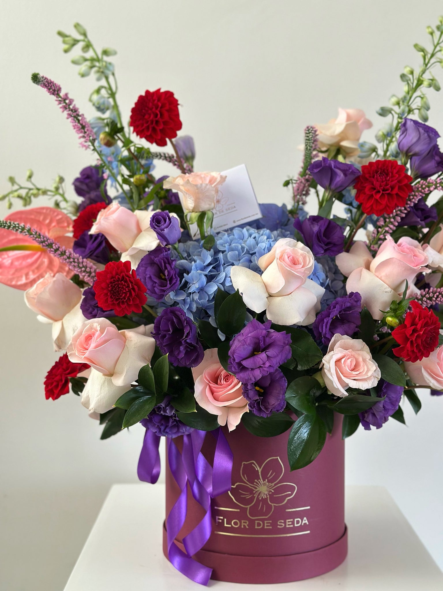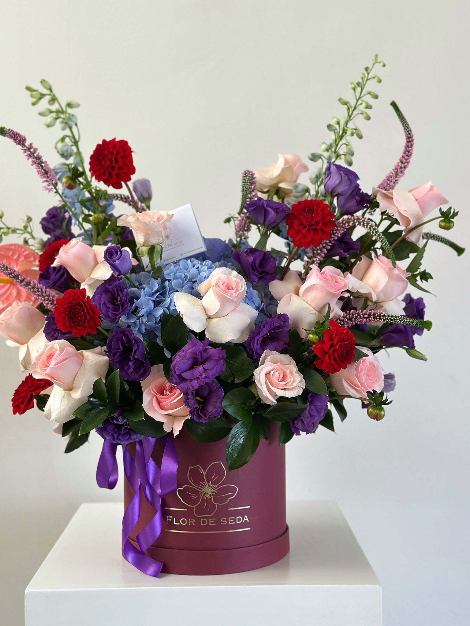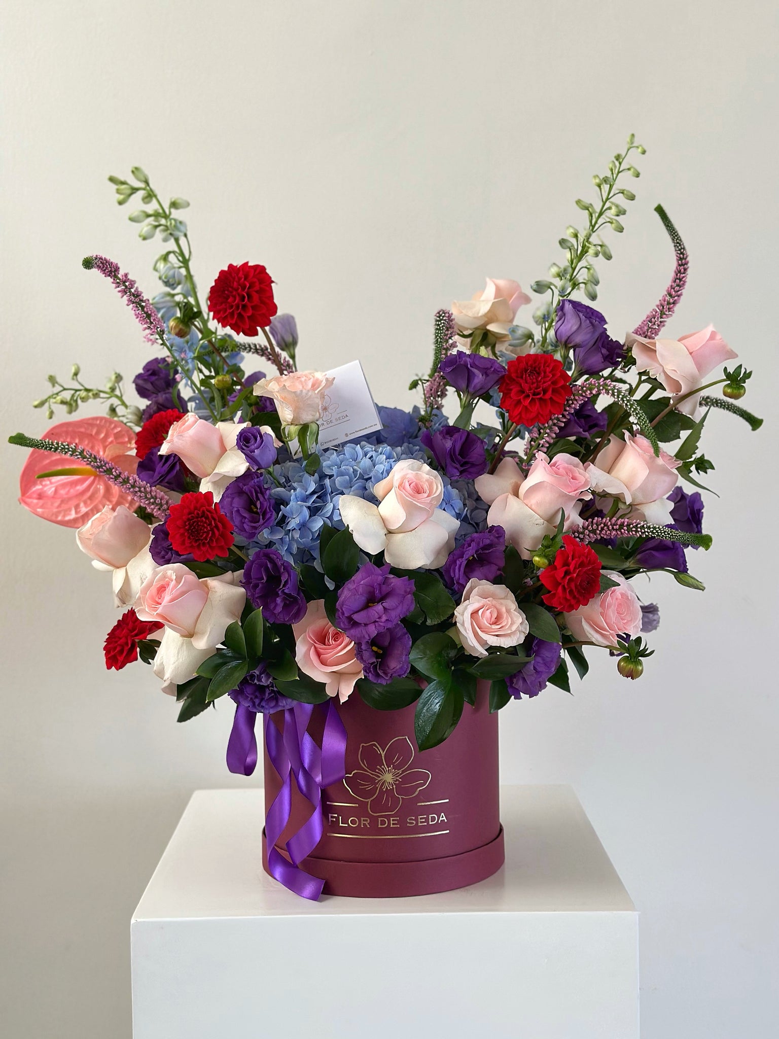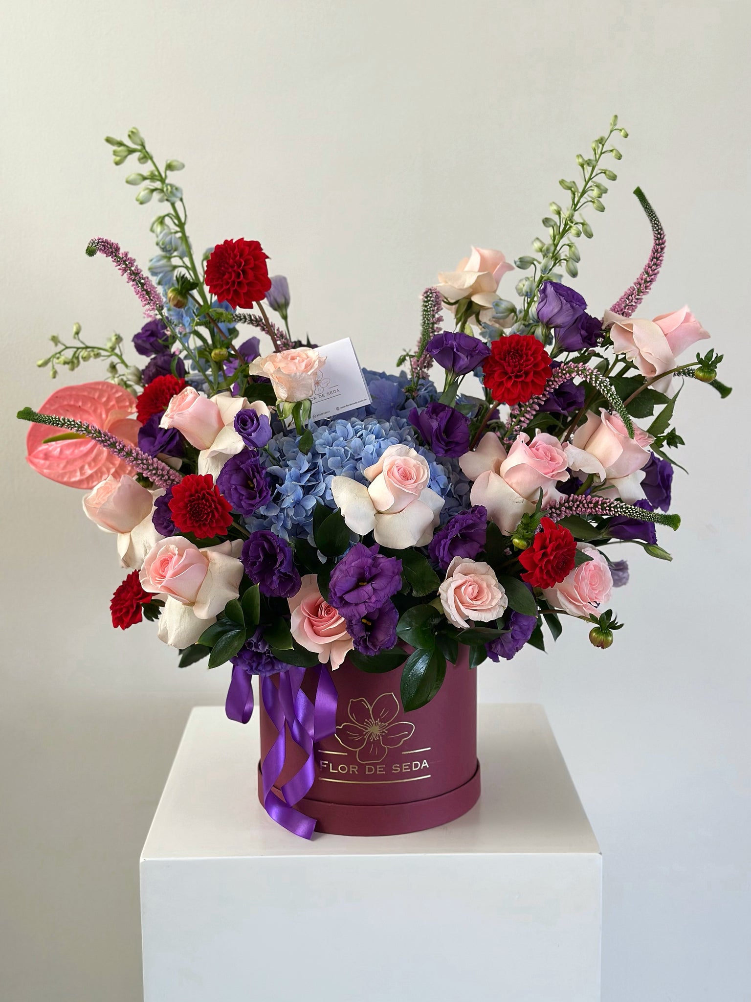 Caja con rosas, lisianthus, anturio, delphinium, veronica, dahlias, hortensias y variedad de follajes.