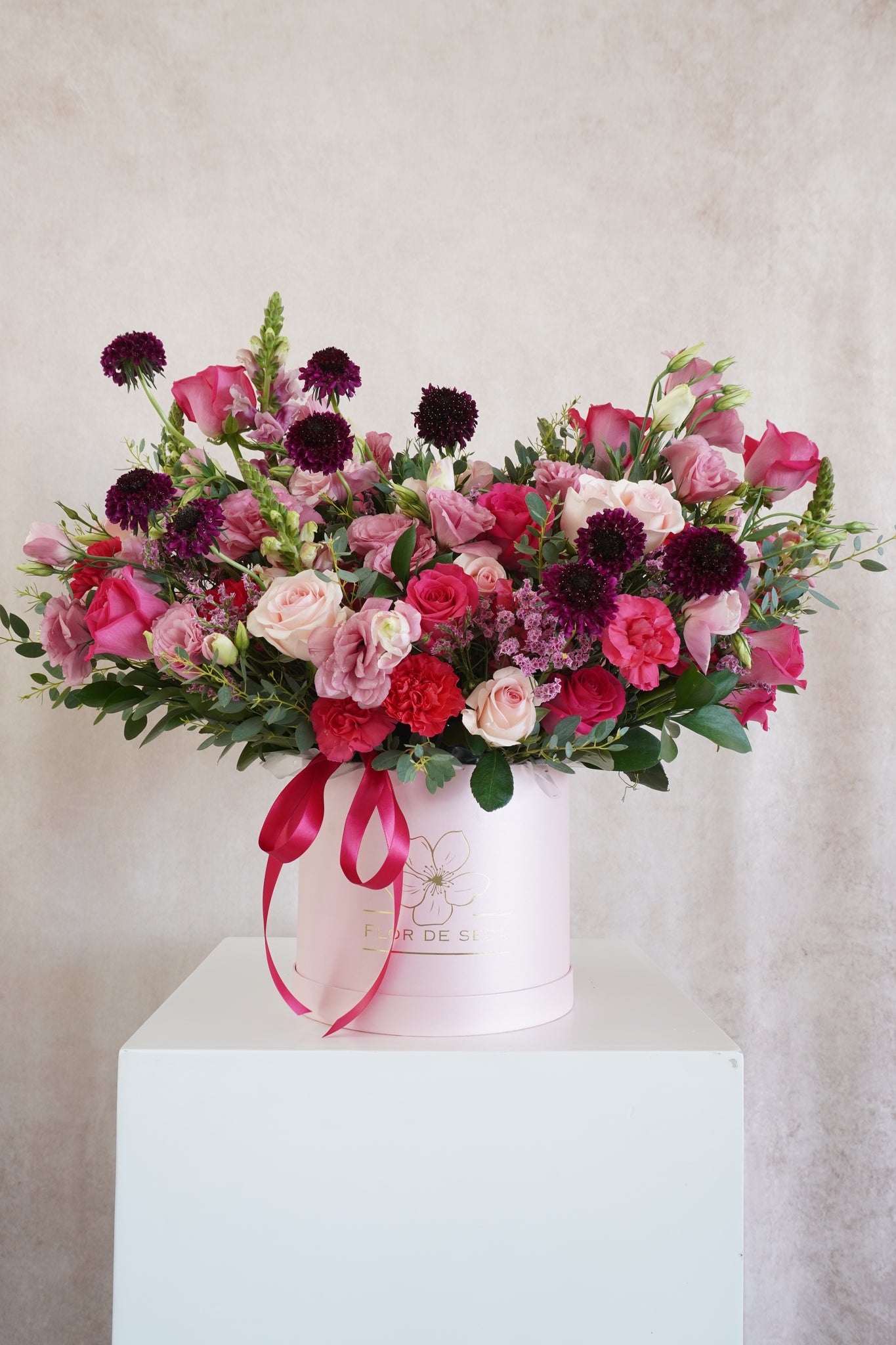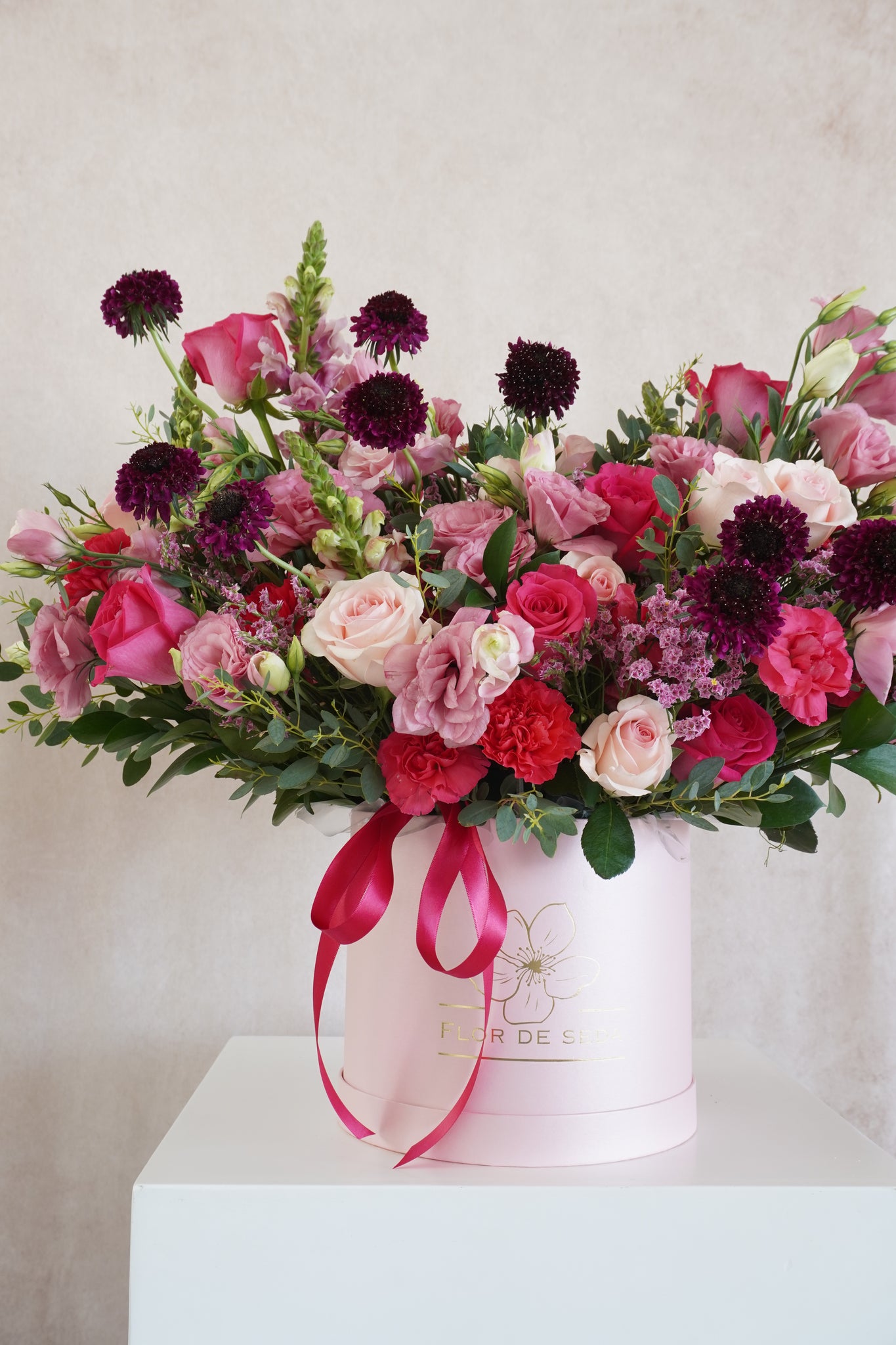Caja con rosas, lisianthus, green, escabiosas, perritos, claveles, limonium y variedad de follajes.