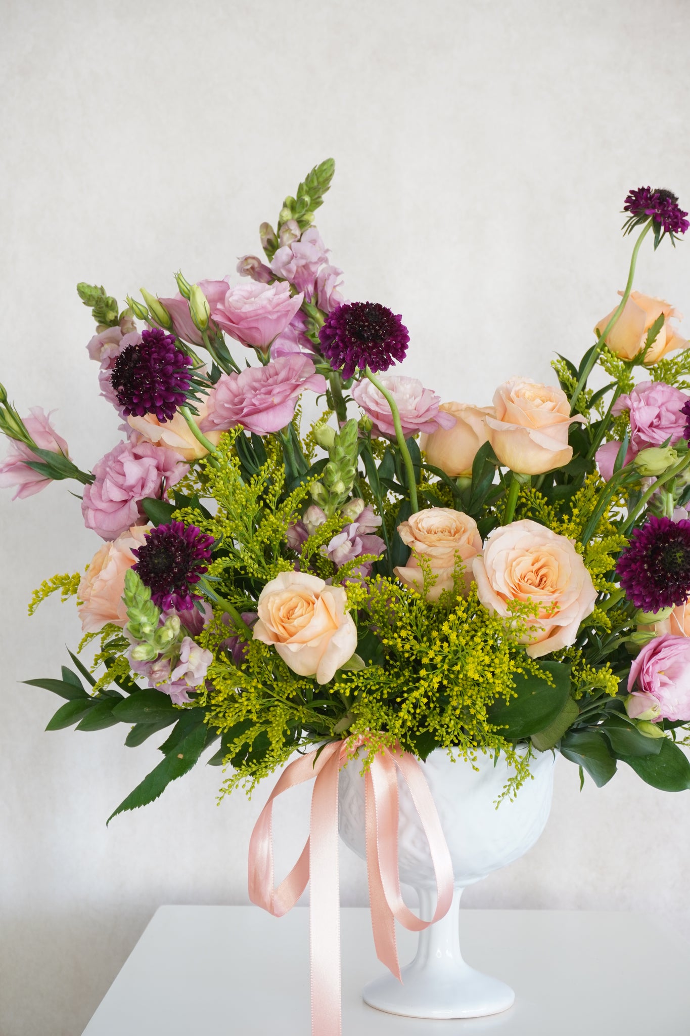 Base con rosas, perritos, escabiosas, lisianthus y follajes.