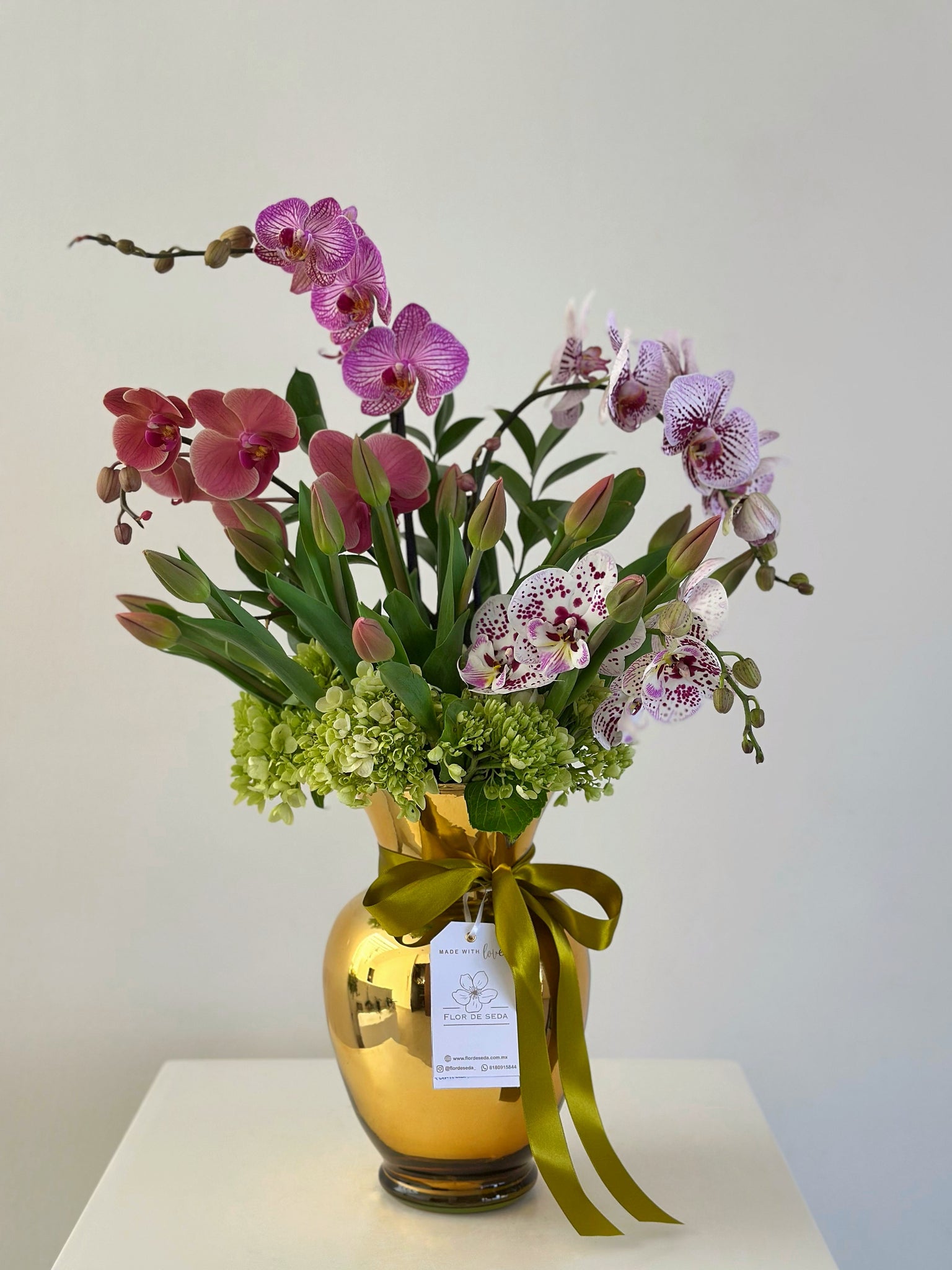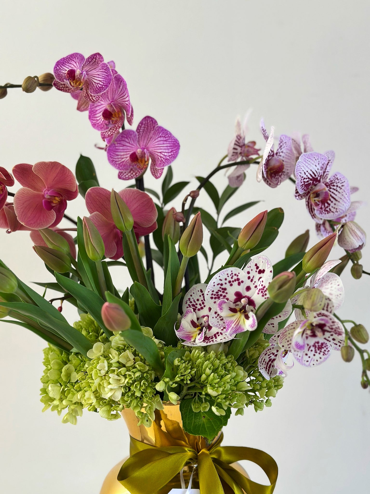Base con tulipanes, orquídeas, hortensia y follaje.