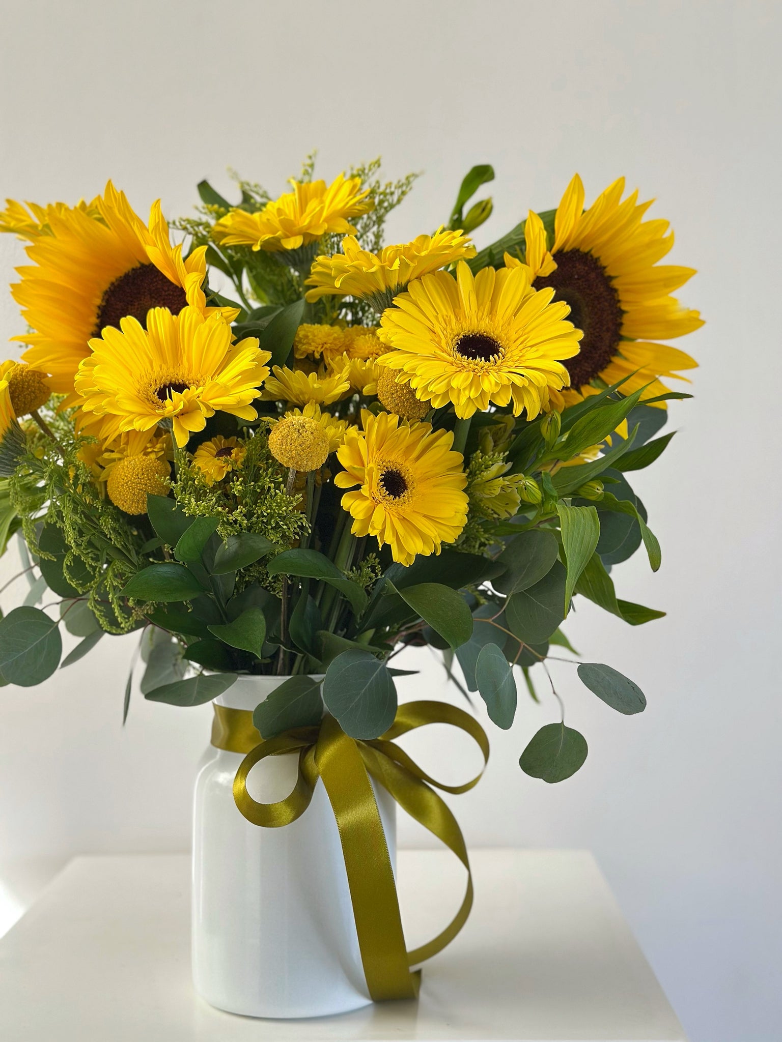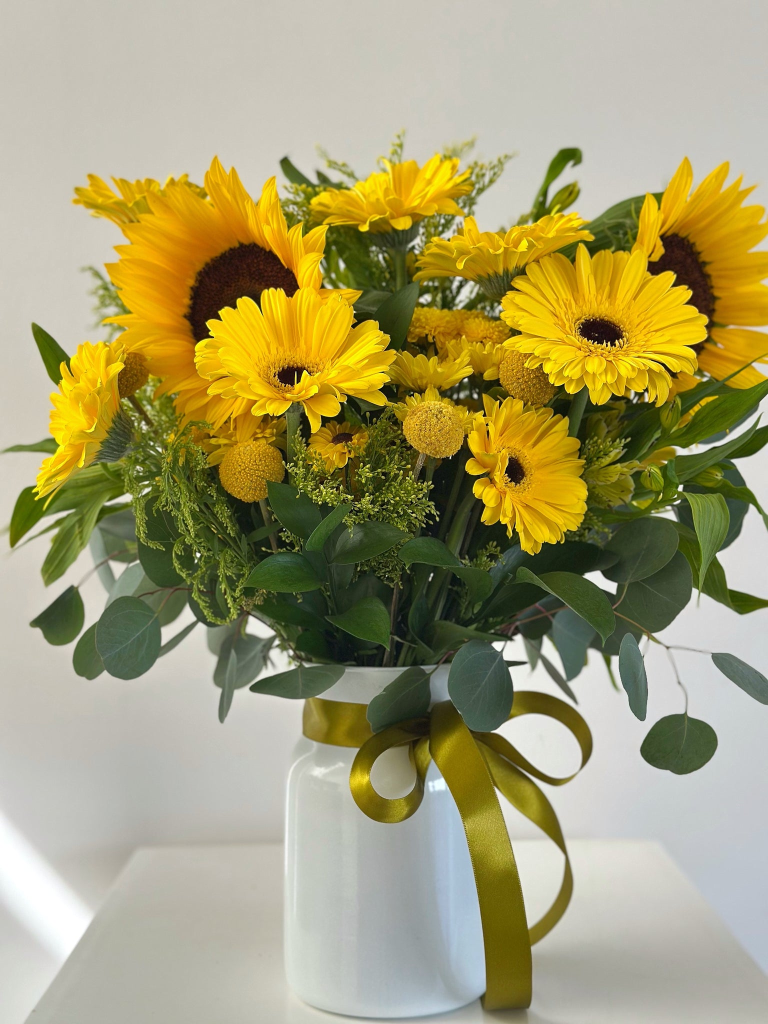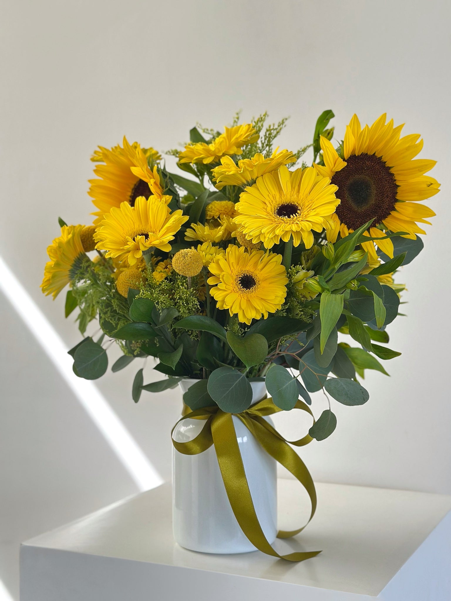 Base con Girasoles, gerberas, craspedia, alstromelia, margarita y follajes.