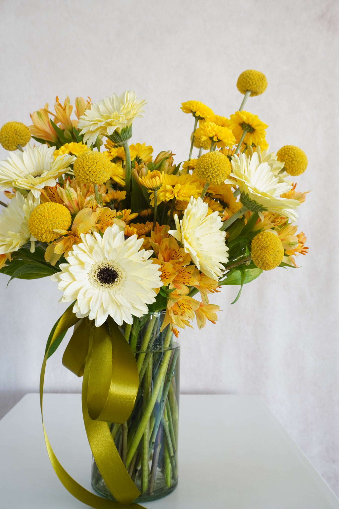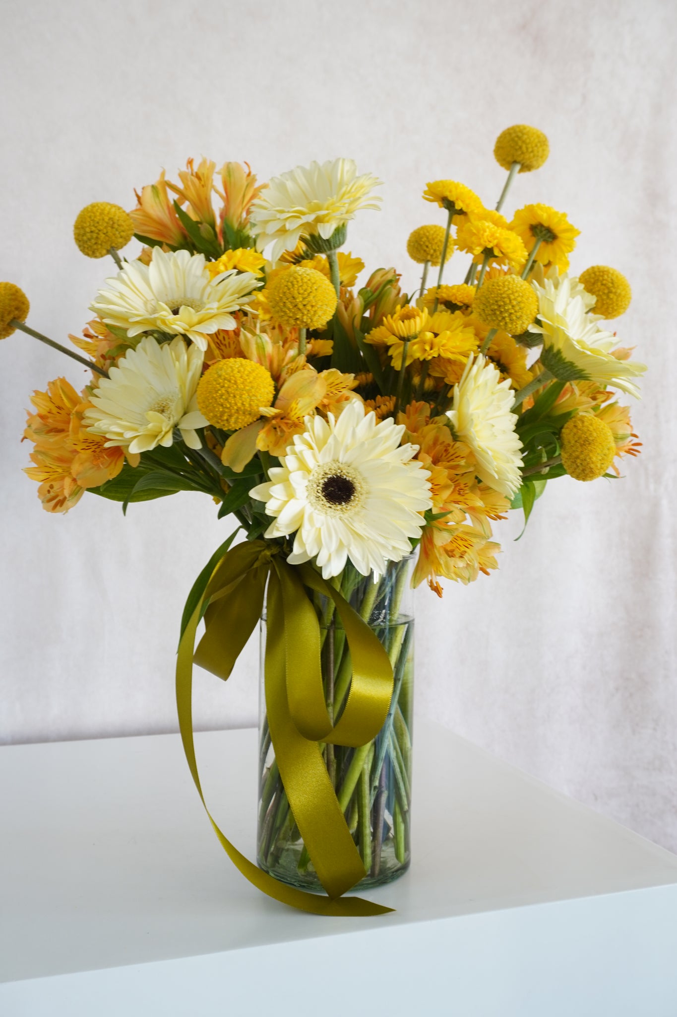 Base con gerberas, variedad de margaritas, craspedia, alstromelia y follaje.